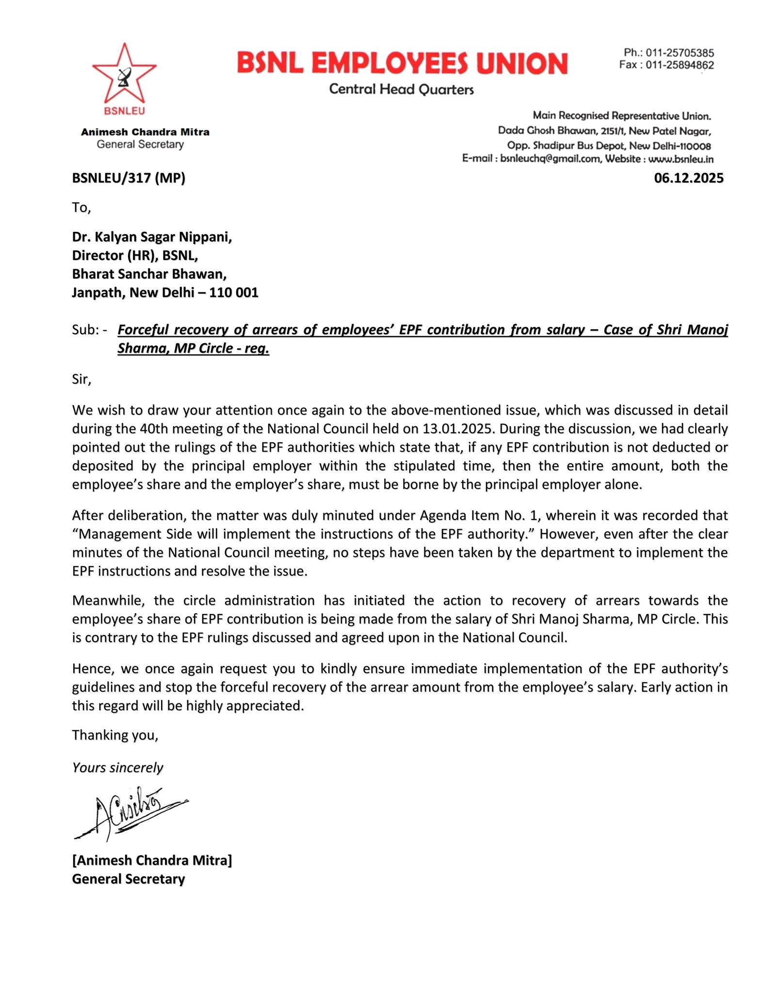 कर्मचाऱ्यांच्या ईपीएफ योगदानाच्या थकबाकीची सक्तीने वसुली - सीएचक्यू संचालक (एचआर), बीएसएनएल यांना लिहितो.